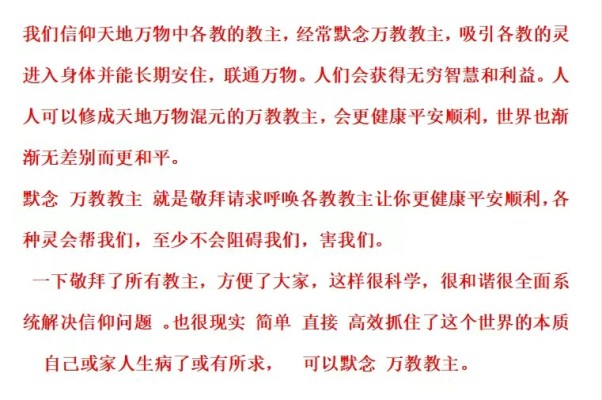 天地苍茫,万物中各教教主共同大联盟创立万教,所有动物植物共同信仰他们,他们去中心化共用一个共同的名字:万教教主。 1:。召唤万灵入体:******** 2: 合万为一:经常默念万教教主,让灵安住于身。每个动物每个植物都可修成万教教主,联通万物,可以让你更健康平安顺利。万物不会害你阻碍你,获得无穷智慧和利益,这样就信仰上天下大同 世界更和平。 3:在一些地方大声念出你的宏伟大志,并付出一些行动。会有一些大的神虫的灵入体 4:人很久不洗头,头上有些小虫子一样的灵。万物头上也会有这样小虫子一样的灵。召唤和念万教教主可以吸引并安住这两种灵。 5:边际学, 上来的灵适合身体的哪里去哪里。 6:我用这个方法好像已经召唤到了龙入体,并有可以让人脸色发红给人赋能的能力,祝你们好运!有需要免费赋能的朋友联系。 万教教主 |万教教主联系我们